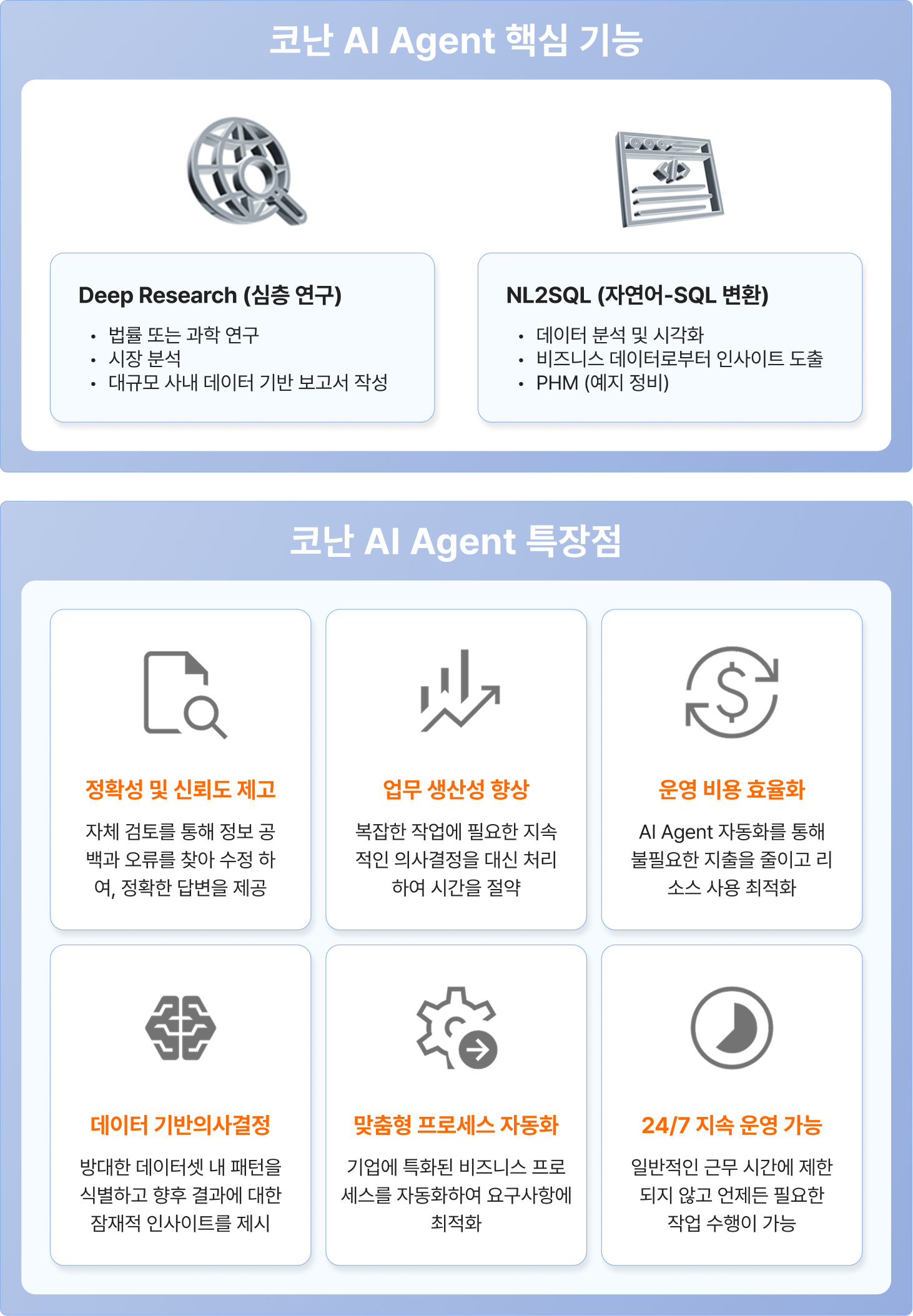코난 AI Agent는 딥 리서치(Deep Research)와 NL2SQL 두 가지 핵심 기능을 제공합니다.
