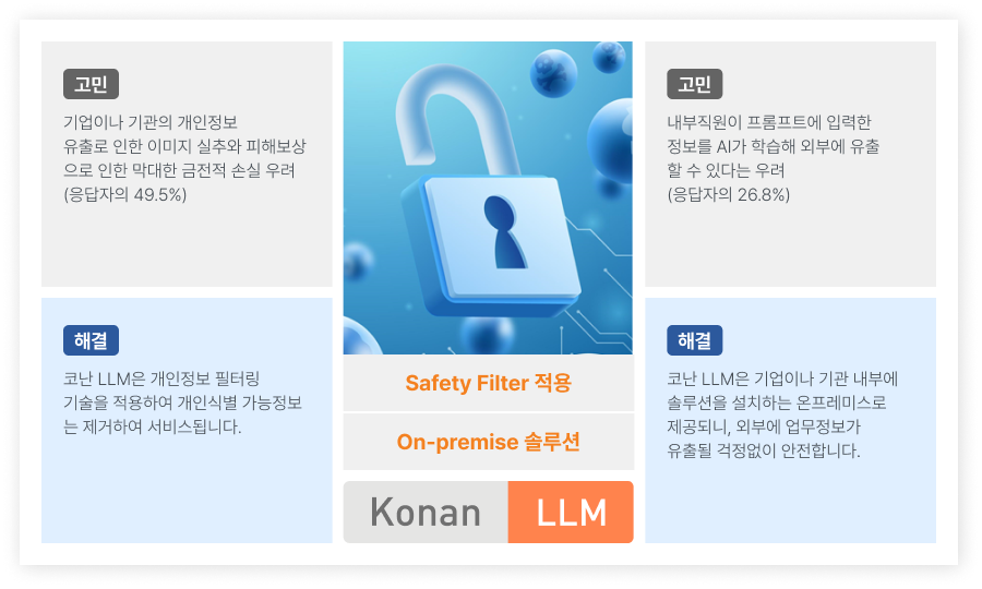 코난 LLM은 '온프레미스솔루션'으로 제공하여 민감정보에 대한 안전을 보장합니다.