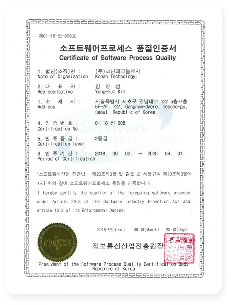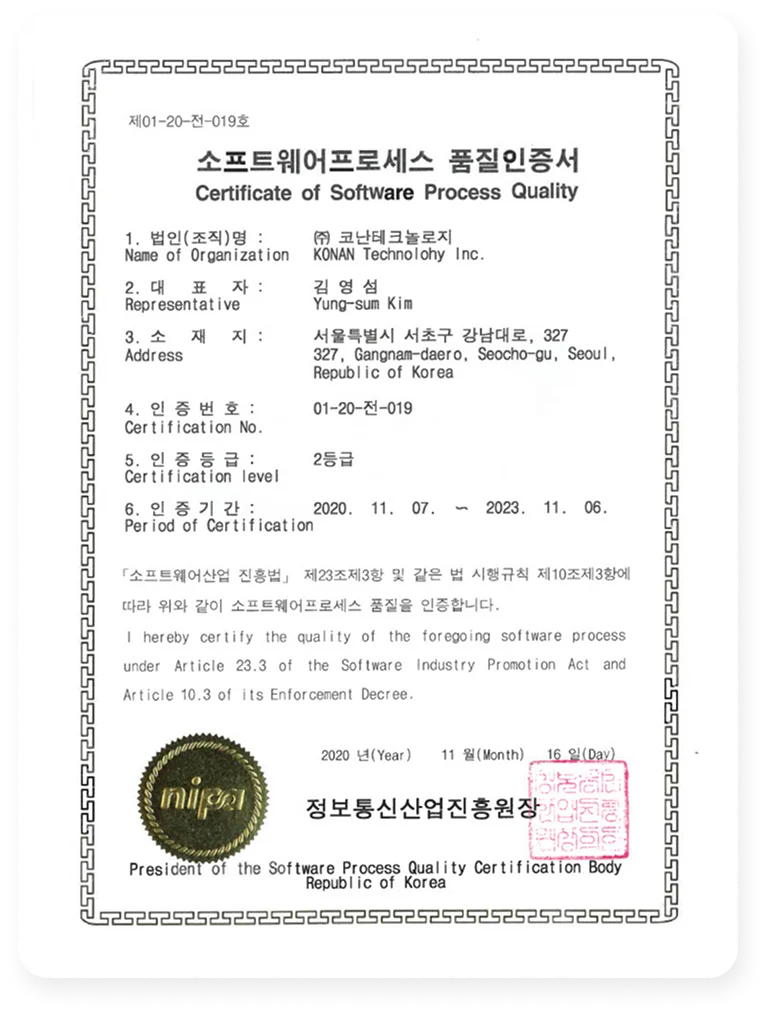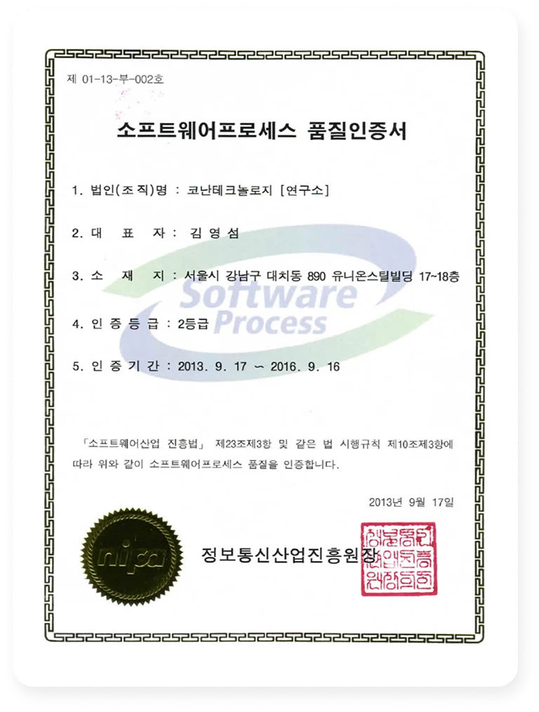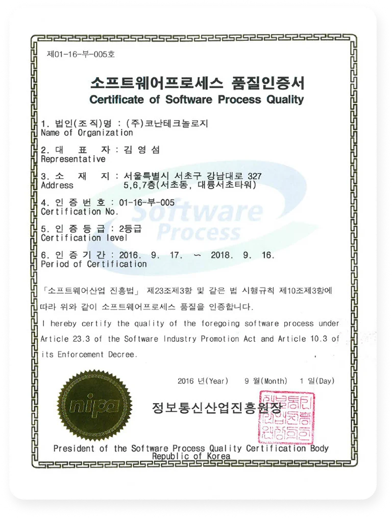 코난테크놀로지는 2013년 이후부터 연속 5회에 걸쳐 지속적으로 SP인증을 받고 있습니다.