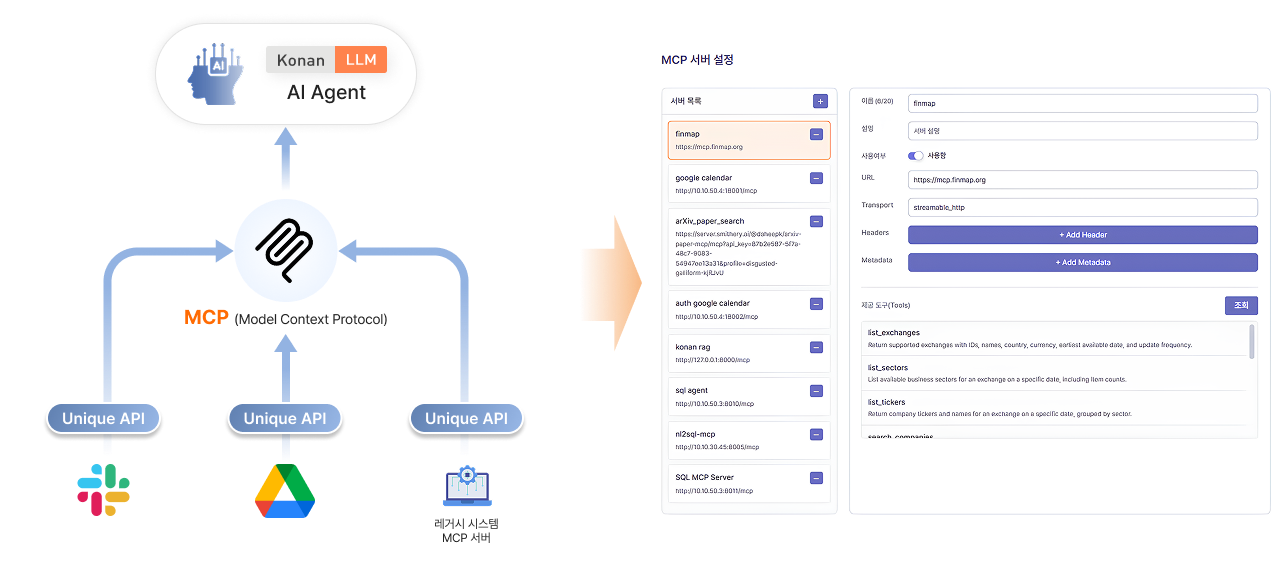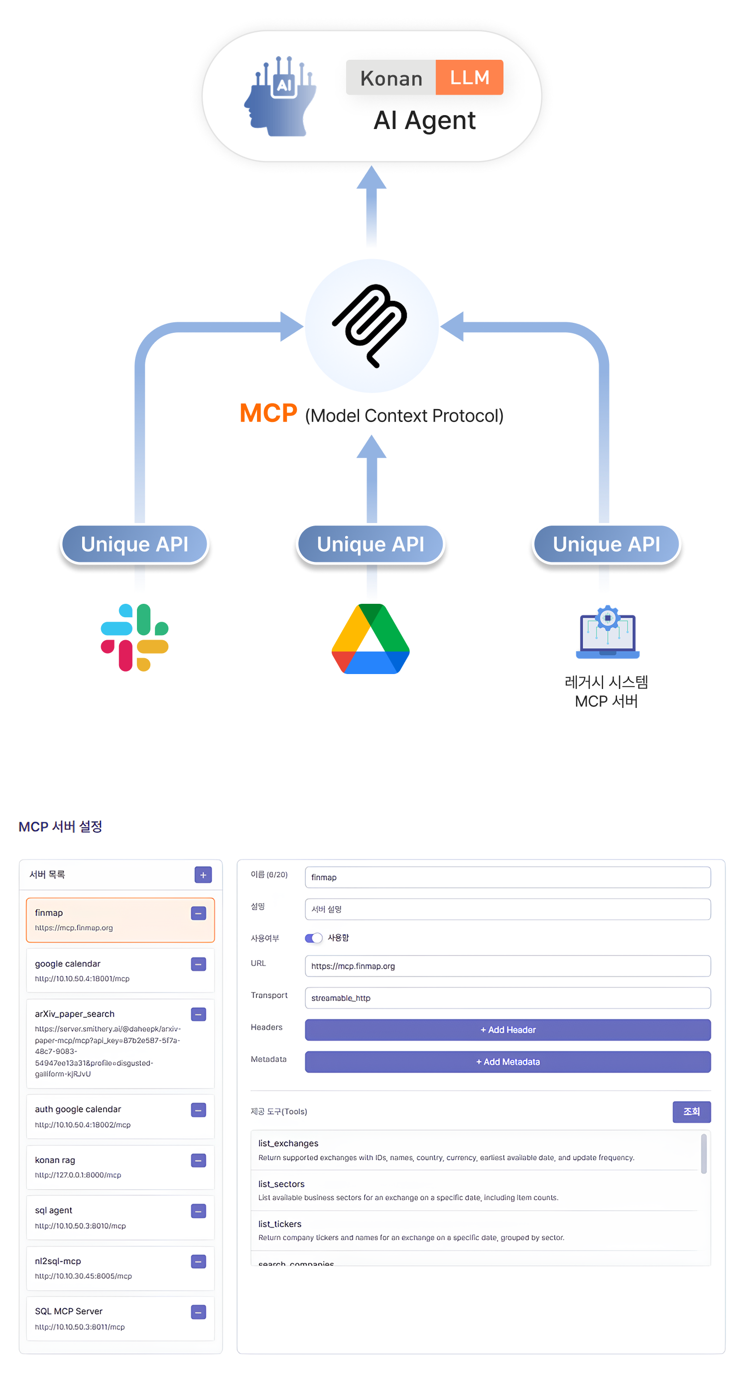 MCP(Model Context Protocol)를 적용한 코난 LLM은 외부 서비스와 데이터를 표준 방식으로 연동해 필요한 컨텍스트를 즉시