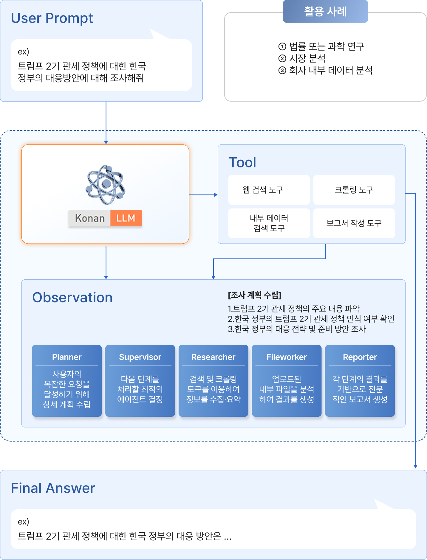 코난 LLM은 다중에이전트 협업시스템을 기반으로 공공, 금융, 기업, 의료 등에 적용 가능한 지능형 에이전트 플랫폼을 제공합니다.